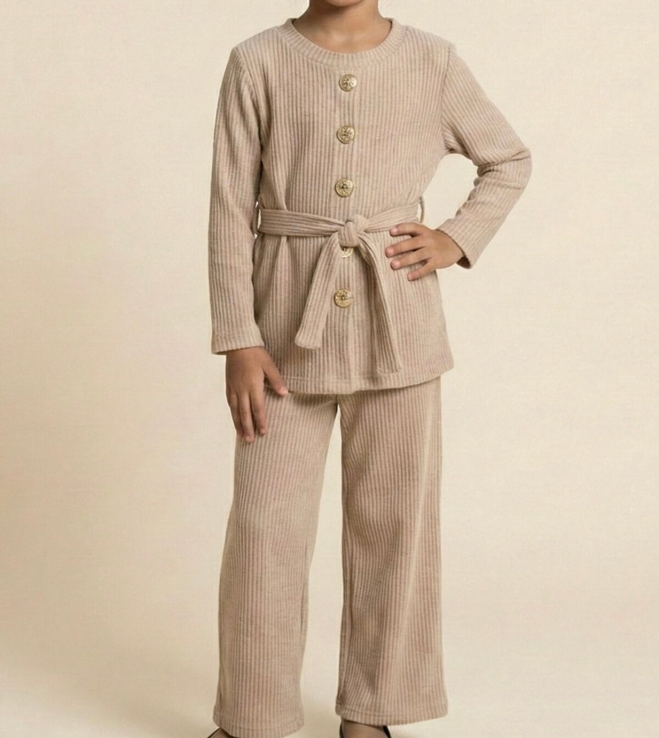 The Girls Corduroy Button Sets feature a coordinated outfit comprising a top and trousers designed for children. Constructed from durable corduroy fabric, this set provides comfort and style. The button detailing enhances functionality and ease of dressing, making it a practical choice for daily wear.